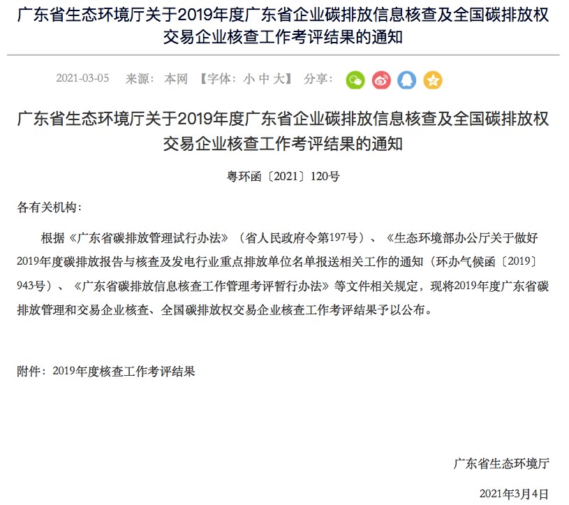 2021年3月4日,广东省生态环境厅发布了《广东省生态环境厅关于2019年度广东省企业碳排放信息核查及全国碳排放权交易企业核查工作考评结果的通知》(粤环函〔2021〕120号),公布了广东省生态环境厅2019年度广东省企业碳排放信息核查及全国碳排放权交易企业核查工作考评结果,其中北京科吉环境技术发展有限公司在核查机构考评中获评“优”。